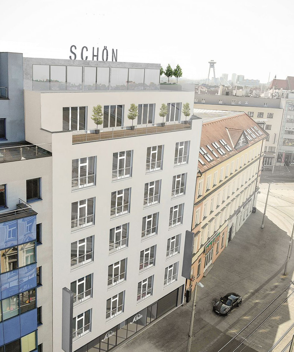 The Schön Residence is being realized by the Murman property development company, which is interested in improving Bratislava's public spaces. The company specializes in reconstructing Functionalist buildings, while adhering to the principle of "respecting the original appearance of the property." It also closely collaborates with the Bratislava Municipal Authority and has successfully renovated the Dunajská 1 Functionalist building.