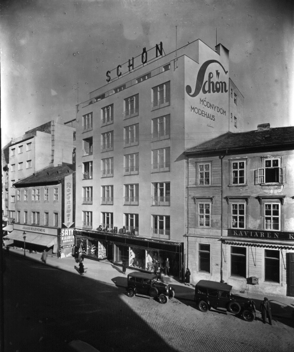 Obchodný a obytný dom na známej adrese Obchodná 4 vznikol v roku 1934 na zakázku firmy Siegfried & Max Schön, podľa ktorej dodnes nesie svoje meno. Slúžil ako polyfunkčný objekt – obchodný dom na prvých dvoch podlažiach, kancelárske priestory na treťom podlaží a na ostatných podlažiach sa nachádzali dvoj a trojizbové byty. Za návrhom tejto budovy stáli Fridrich Weinwurm s Ignácom Vécseiom, kľúčové architektonické duo slovenskej architektúry, ktorého heslom bolo funkčné bývanie pre každého. Architekt Weinwurm stojí za návrhmi niekoľkých prevratných budov, ktoré na Slovensku vznikli v medzivojnovom období. Okrem polyfunkčnej budovy Schön sa jedná o obytný súbor Nová doba, bytové domy Unitas či Vilu L v Bratislave. Jeho dielo stelesňuje filozofiu jasnosti a jednoduchosti stavieb bez zbytočných ozdôb a s maximálnou funkčnosťou.